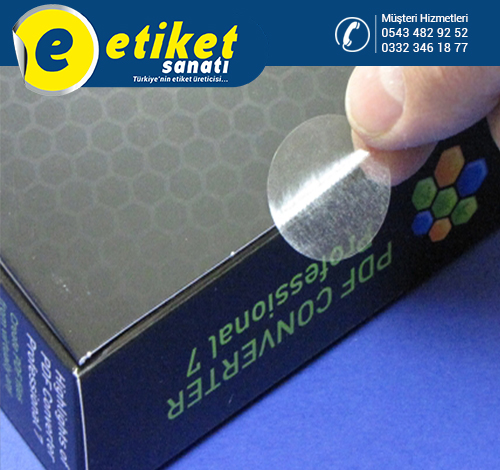 Şeffaf: Ürünlerin görünümünü engellemeden güvenli bir şekilde kapatılmasını sağlar. Kendinden yapışkanlı: Kolay uygulama imkanı sunar, ek yapıştırıcı gerektirmez. Farklı boyut ve şekillerde üretilebilir: Yuvarlak, oval, dikdörtgen gibi çeşitli seçenekler mevcuttur. PVC malzemeden üretilmiştir: Dayanıklı ve uzun ömürlüdür. Su ve nemden etkilenmez: Ürünlerin içeriğini korur. Kozmetik, gıda, ilaç gibi birçok sektörde kullanılır. Kutu kapak kapatma etiketlerinin kullanım alanları: Paketler, Çantalar, Kutular, Zarflar, Kavanozlar ,Şişeler